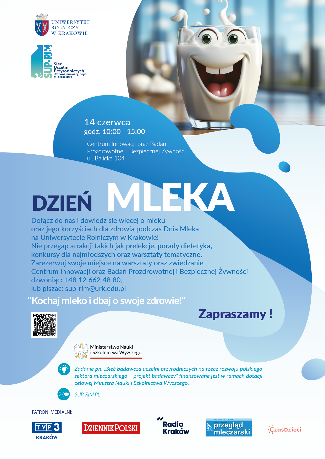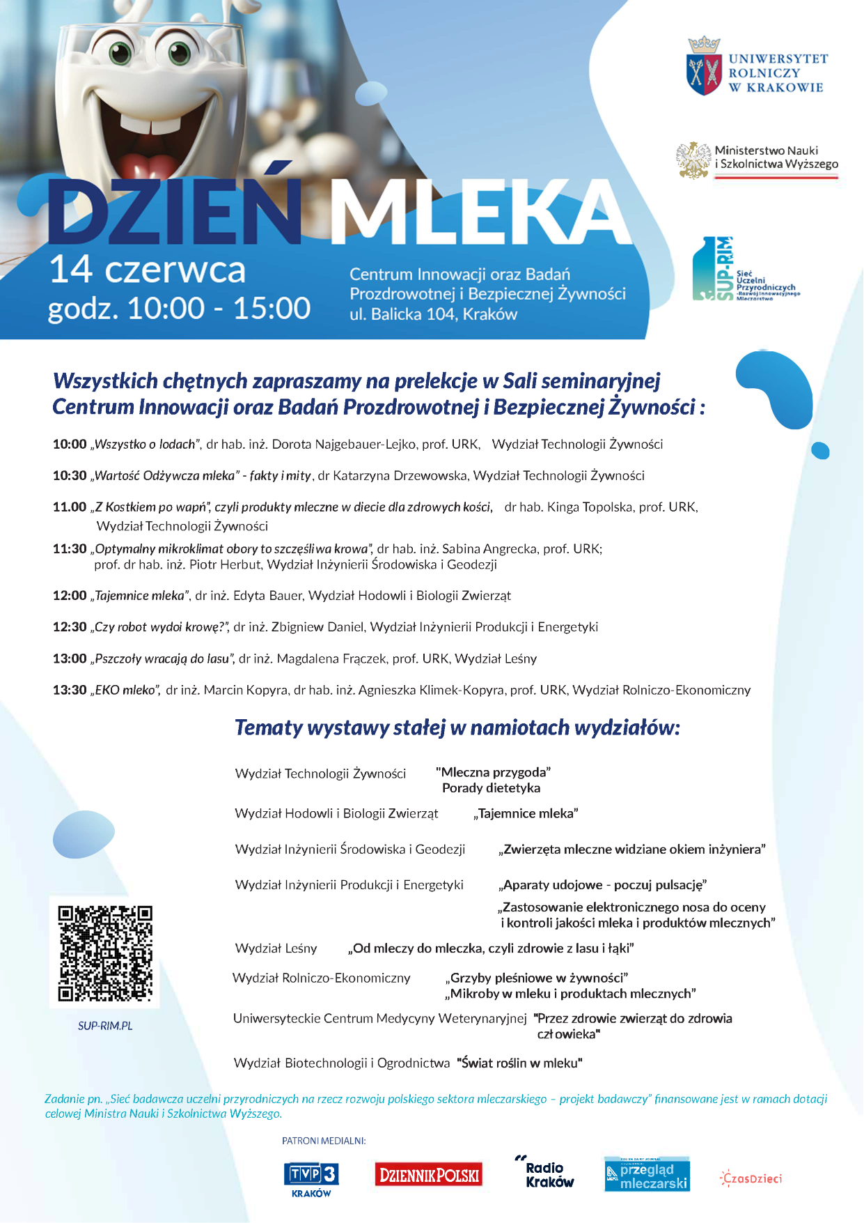 Dzień Mleka, 14 czerwca godz. 10:00 - 15:00, Centrum Innowacji oraz Badań Prozdrowotnej i Bezpiecznej Żywności Uniwersytetu Rolniczego w Krakowie